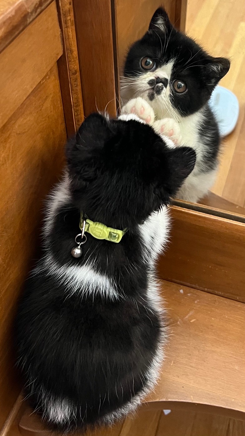 My vet would like to use the picture of him and Maxx. As you'll see there is also a neat picture of Maxx telling him a joke, and whispering in his ear. They are inseparable. He has also learned to climb to the top of the cat tree (12 feet) (picture 4) and throws out the stuffed animals.